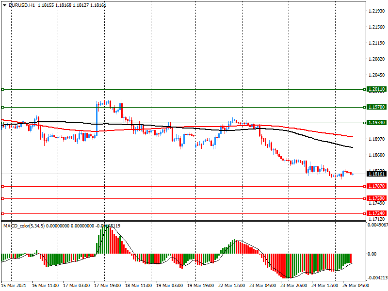 Вчера пара EUR/USD торговалась с понижением и закрыла день в красной зоне около цены $1.1810. Сегодня пара торговалась в узком диапазоне $1.1805-25, оставаясь вблизи минимумов ноября 2020. На часовом графике EUR/USD все еще торгуется ниже линии скользящей средней МА (200) Н1 ($1.1905). На четырехчасовом графике ситуация аналогичная. Исходя из вышесказанного, вероятно, стоит придерживаться южного направления в торговле и пока пара остается ниже MA 200 H1, необходимо искать точки входа на продажу на формирование коррекции.