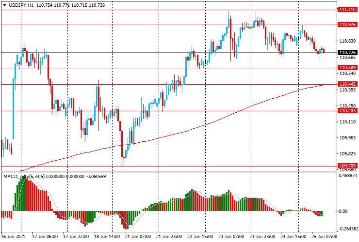 Вчера пара USD/JPY торговалась с понижением и закрыла день в красной зоне около цены Y110.85. Сегодня пара торговалась в узком диапазоне Y110.85-95, оставаясь вблизи максимумов марта 2020. На часовом графике USD/JPY все еще торгуется выше линии скользящей средней МА (200) Н1 (Y110.40). На четырехчасовом графике ситуация аналогичная. Исходя из вышесказанного, вероятно, стоит придерживаться северного направления в торговле и пока пара остается выше MA 200 H1, необходимо искать точки входа на покупку на формирование коррекции.