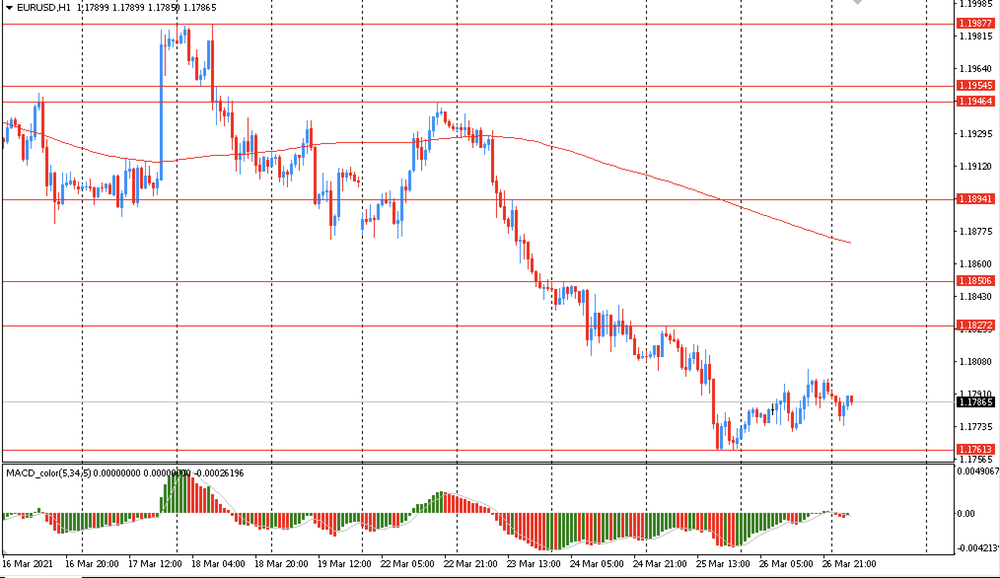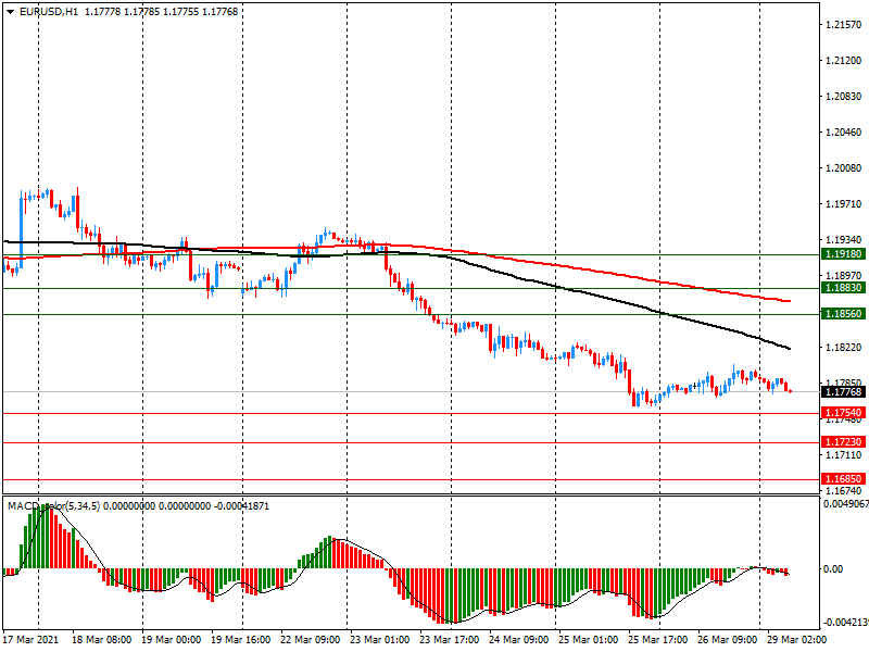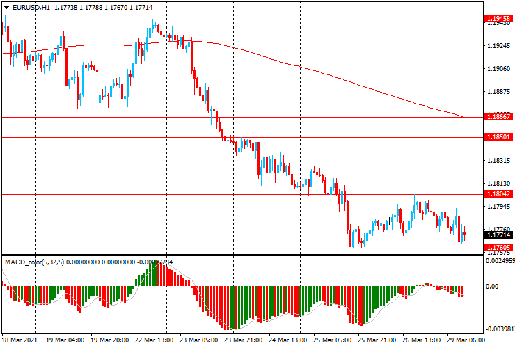 В пятницу пара EUR/USD торговалась разнонаправлено в диапазоне $1.1770-$1.1800 и закрыла день без существенных изменений. Сегодня пара также торговалась в узком диапазоне $1.1775-90, оставаясь вблизи минимумов ноября 2020. На часовом графике EUR/USD все еще торгуется ниже линии скользящей средней МА (200) Н1 ($1.1870). На четырехчасовом графике ситуация аналогичная. Исходя из вышесказанного, вероятно, стоит придерживаться южного направления в торговле и пока пара остается ниже MA 200 H1, необходимо искать точки входа на продажу на формирование коррекции.