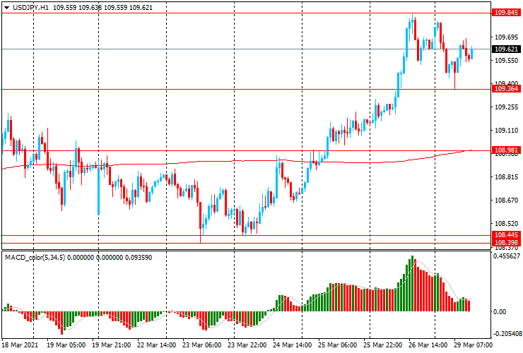 В пятницу пара USD/JPY торговалась с повышением и закрыла день на положительной территории около цены Y109.65. Сегодня пара торговалась в узком диапазоне Y109.45-80, оставаясь вблизи максимумов июня 2020. На часовом графике USD/JPY все еще торгуется выше линии скользящей средней МА (200) Н1 (Y108.95). На четырехчасовом графике ситуация аналогичная. Исходя из вышесказанного, вероятно, стоит придерживаться северного направления в торговле и пока пара остается выше MA 200 H1, необходимо искать точки входа на покупку на формирование коррекции.