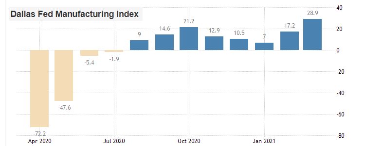 Федеральный резервный банк Далласа сообщил в понедельник, что его общий индекс деловой активности в производственной сфере Техаса вырос до 28,9 в марте с 17,2 в феврале, что указывает на расширение производственной активности в Техасе восьмой месяц подряд. Это также было самое высокое значение с августа 2018 года. Индекс перспектив компаний вырос на 15 пунктов до 25,8, что стало самым высоким показателем с середины 2018 года.