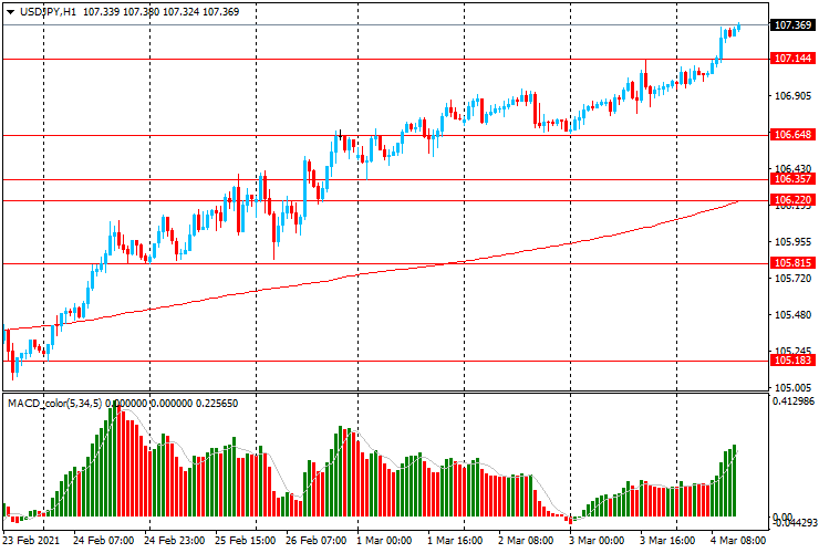 Вчера пара USD/JPY торговалась с повышением и закрыла день на положительной территории около цены Y107.00. Сегодня пара торговалась в узком диапазоне Y106.95-10, оставаясь около максимумов августа 2020. На часовом графике USD/JPY все еще торгуется выше линии скользящей средней МА (200) Н1 (Y106.15). На четырехчасовом графике ситуация аналогичная. Исходя из вышесказанного, вероятно, стоит придерживаться северного направления в торговле и пока пара остается выше MA 200 H1, необходимо искать точки входа на покупку на формирование коррекции.