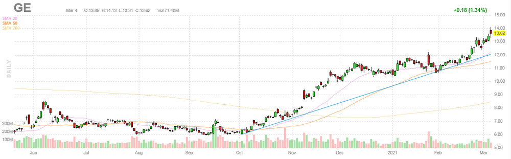 На текущий момент акции GE котируются по $13.62 (+1.34%).