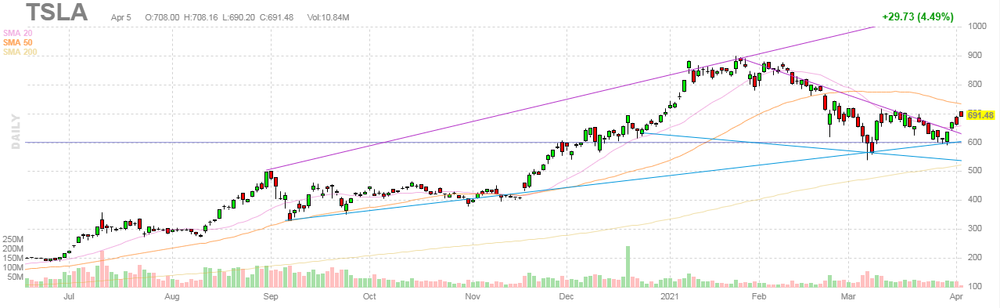 На текущий момент акции TSLA котируются по $691.48 (+4.49%).