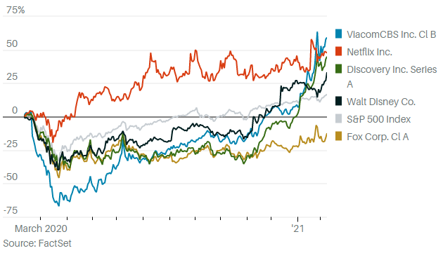 Акции Disney выросли примерно на 35% за последний год, включая рост на 23% с середины декабря, когда компания провела мероприятие День инвестора, основной темой которого стали ее стриминговые сервисы. Для сравнения: за аналогичный период акции Netflix выросли на 49%, Discovery (DISCA) - на 45%, индекс Dow Jones Industrial Average - на 9%, а S&P 500 - на 19%.