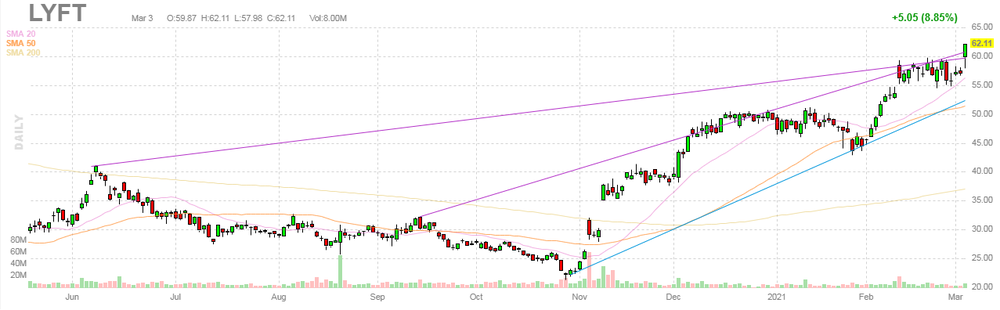 На текущий момент акции LYFT котируются по $62.11 (+8.85%).