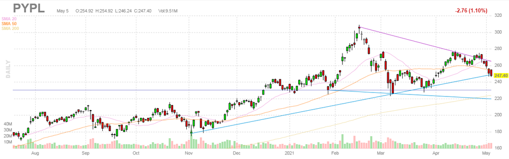 PayPal сообщила, что в последнем квартале заработала $1.22 в расчете на одну акцию, что оказалось выше среднего прогноза аналитиков на уровне $1.01 на одну акцию. Квартальная выручка компании также превзошла оценку аналитиков и компания огласила более сильные, чем ожидалось, прогнозы основных финансовых показателей на текущий квартал и весь 2021 год. Котировки акций PYPL подскочили на 2.1%.