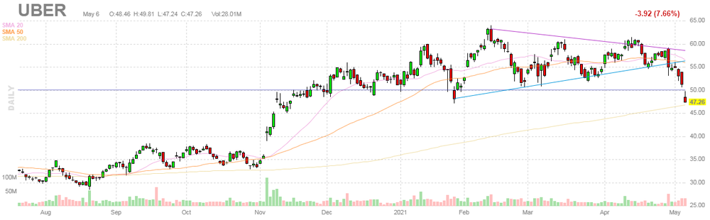 На текущий момент акции UBER котируются по $47.26 (-7.66%).