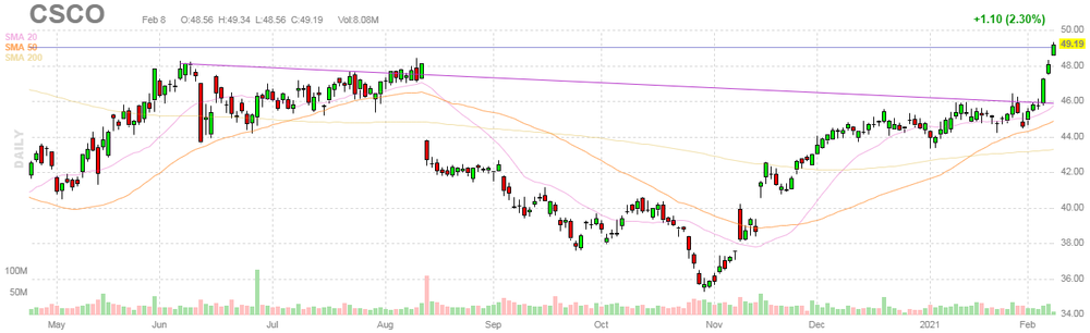 На текущий момент акции CSCO котируются по $49.19 (+2.30%).