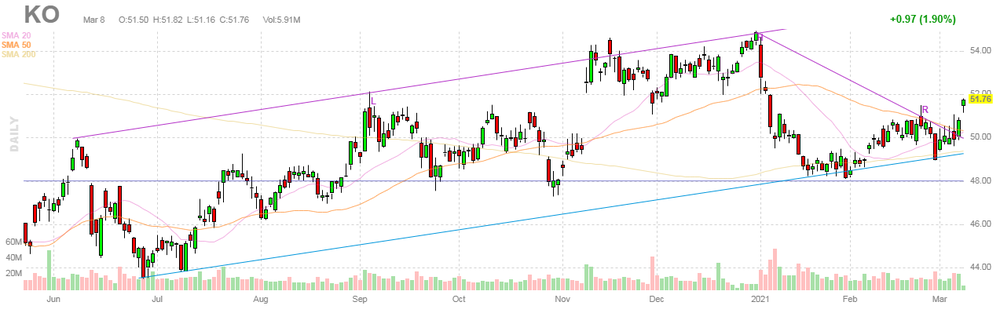На текущий момент акции KO котируются по $51.76 (+1.90%).