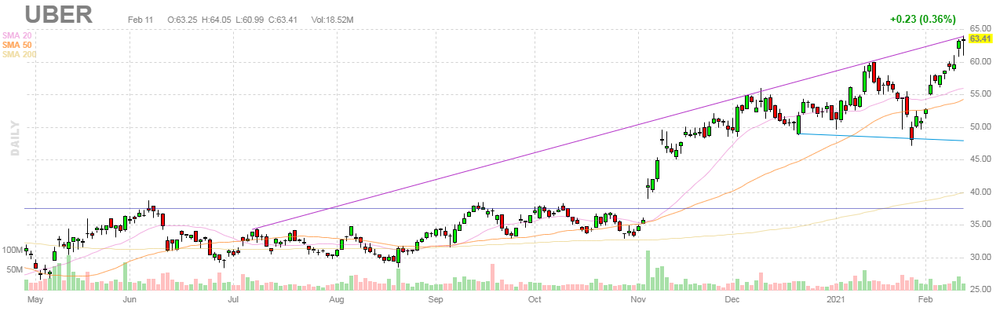 На текущий момент акции UBER котируются по $63.41 (+0.36%).