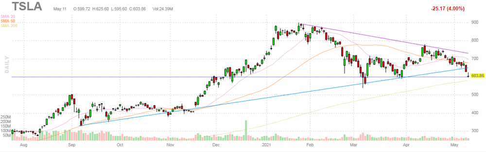 На текущий момент акции TSLA котируются по $603.86 (-4.00%).