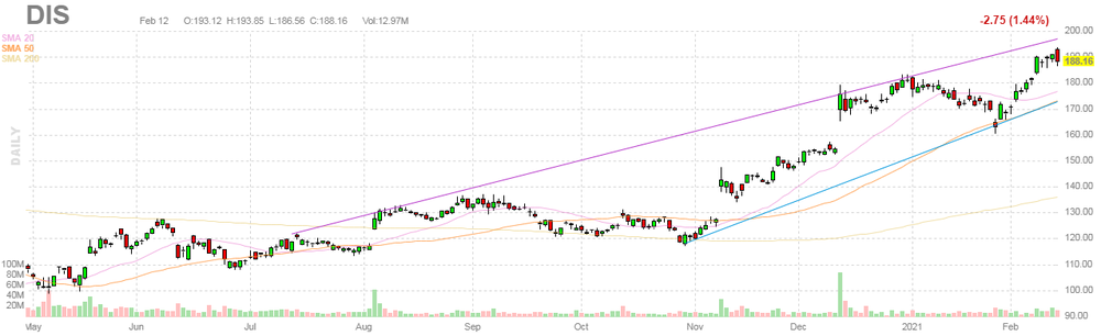 На текущий момент акции DIS котируются по $188.16 (-1.44%).