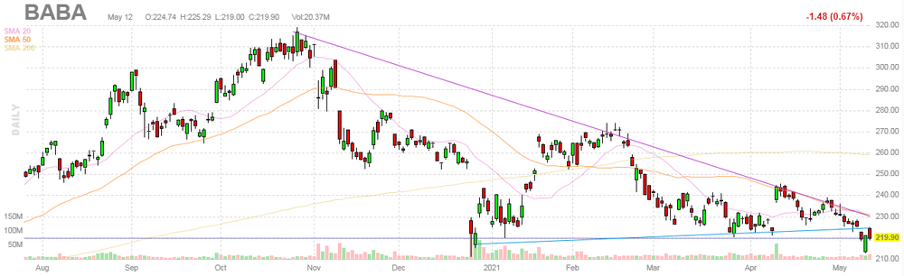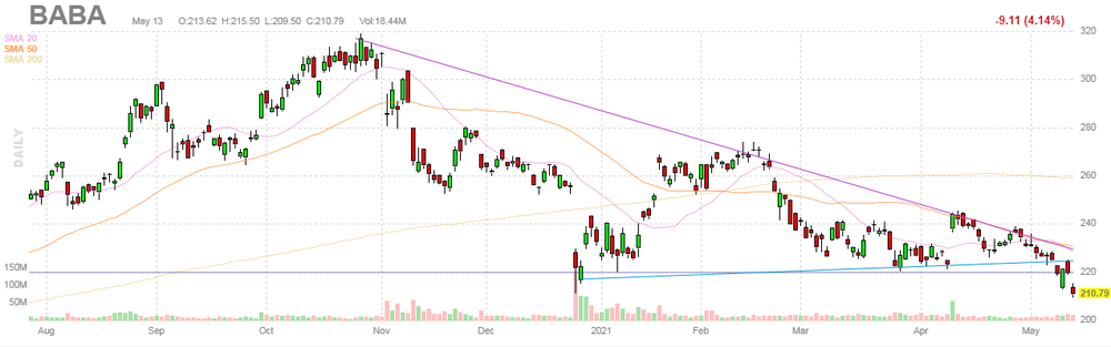На текущий момент акции BABA котируются по $210.79 (-4.14%).