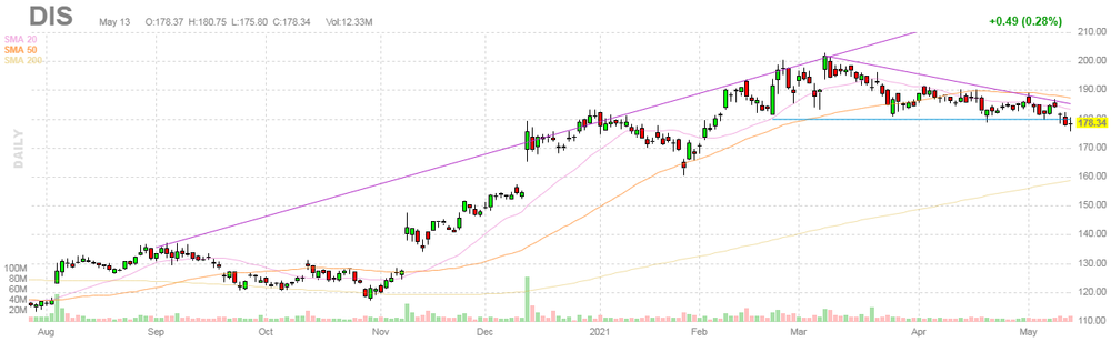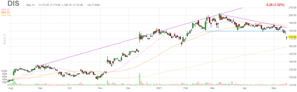 На текущий момент акции DIS котируются по $172.06 (-3.52%).