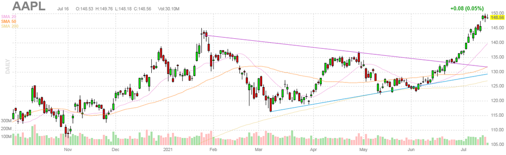 На текущий момент акции AAPL котируются по $148.56 (+0.05%).