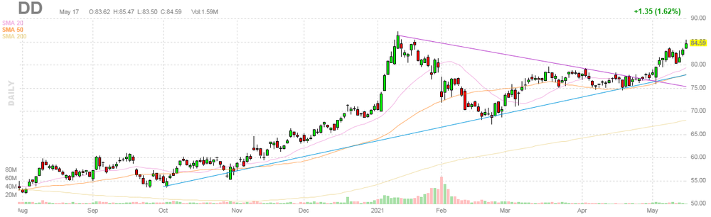 На текущий момент акции DD котируются по $84.59 (+1.62%).