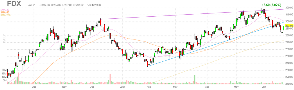 На текущий момент акции FDX котируются по $293.92 (+3.02%).