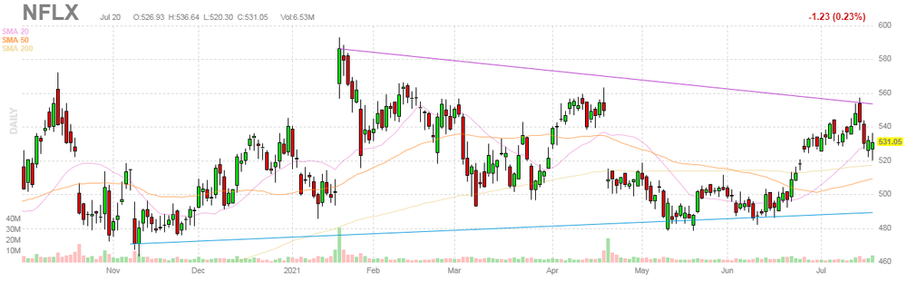 В то же время инвесторы остались разочарованы квартальной отчетностью Netflix (NFLX). Стриминговый сервис сообщил, что по итогам второго квартала 2021 года заработал $2.97 в расчете на одну акцию, что оказалось ниже среднего прогноза аналитиков на уровне $3.16 на одну акцию. В то же время его квартальная выручка в целом совпала с консенсус-оценкой Уолл-стрит. Глобальная база подписчиков компании увеличилась на 1.54 млн., что оказалось выше ранее заявленного прогноза компании в 1.00 млн. Она также огласила неоднозначные прогнозы на текущий квартал, предполагающие прибыль выше ожиданий аналитиков, выручку на уровне и прирост количества подписчиков ниже. Стоимость акций NFLX обвалилась на 3.7%.
