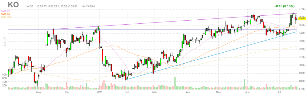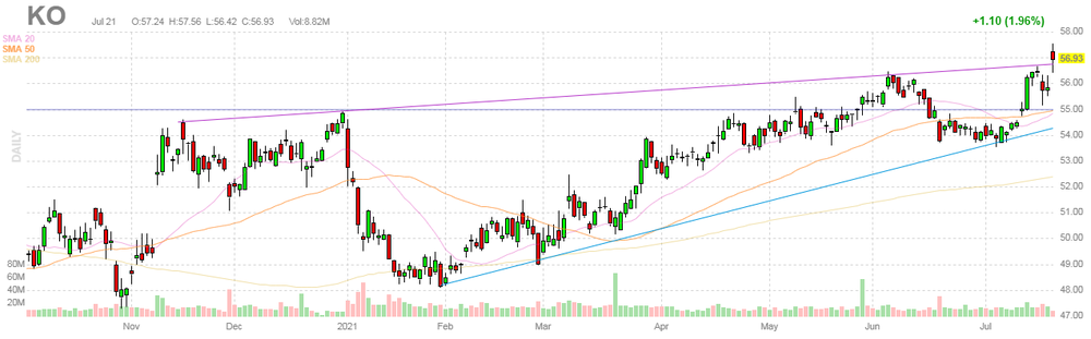 На текущий момент акции KO котируются по $56.93 (+1.96%).