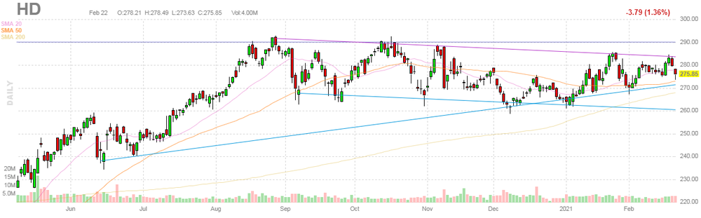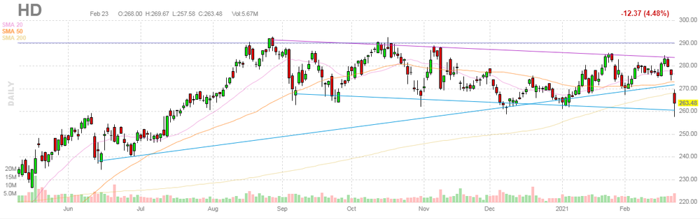 На текущий момент акции HD котируются по $263.48 (-4.48%).