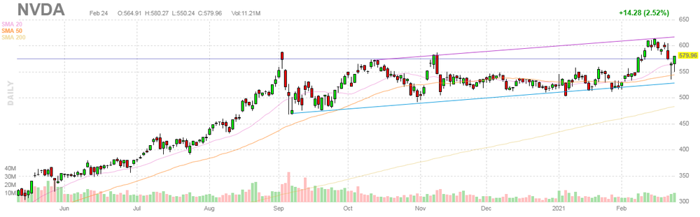 Котировки акций Nvidia сильно росли в последние месяцы: за последний год они выросли более чем на 106%. Инвесторы рассматривают данного производителя микросхем, как ключевого поставщика для нескольких новых технологических трендов. Он продает полупроводниковые компоненты для индустрии компьютерных игр, искусственного интеллекта, центров обработки данных и автомобилей.