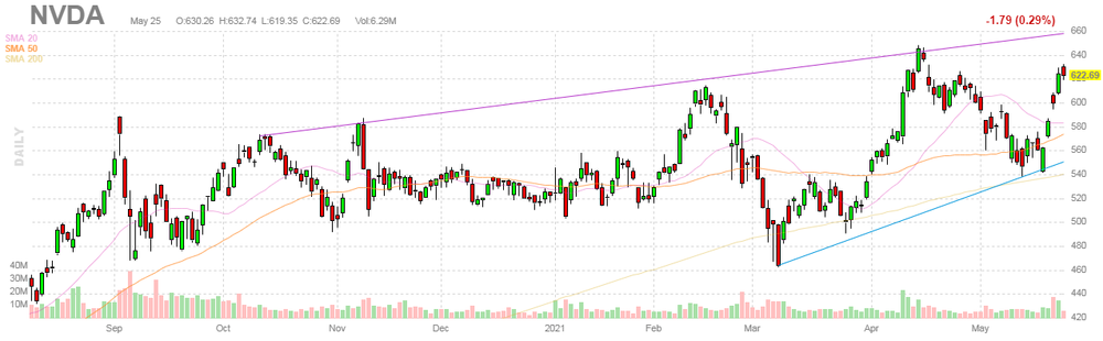 На текущий момент акции NVDA котируются по $622.69 (-0.29%).
