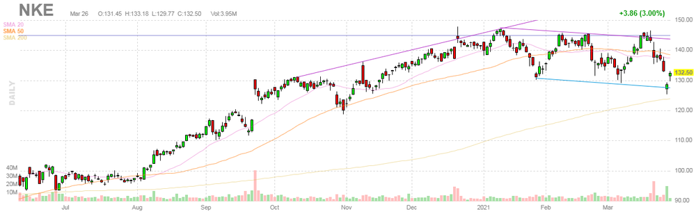 На текущий момент акции NKE котируются по $132.50 (+3.00%).