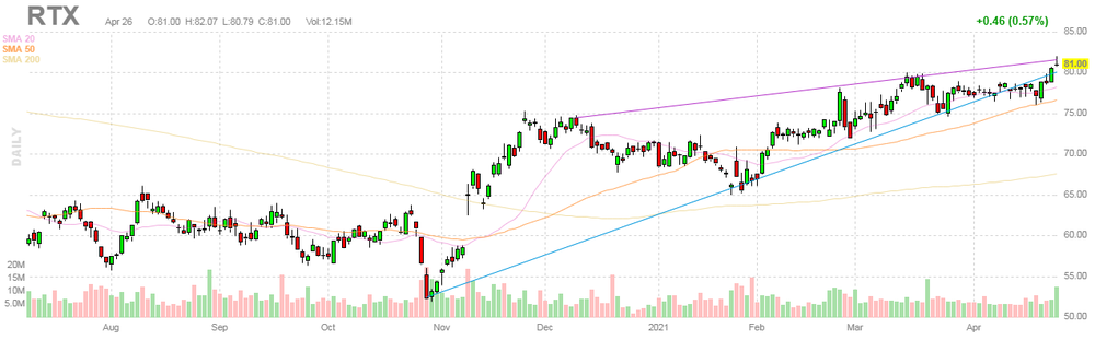 Согласно обнародованному отчету, прибыль компании Raytheon Technologies (RTX) по итогам первого квартала 2021 финансового года (ФГ) достигла $0.90 в расчете на одну акцию (против $1.78 на одну акцию в первом квартале 2020 ФГ), что оказалось выше среднего прогноза аналитиков на уровне $0.73 на одну акцию.