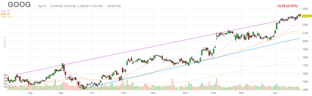 На текущий момент акции GOOG котируются по $2314.06 (-0.55%).