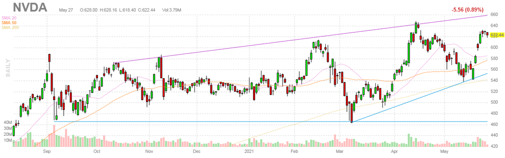 На текущий момент акции NVDA котируются по $622.44 (-0.89%).