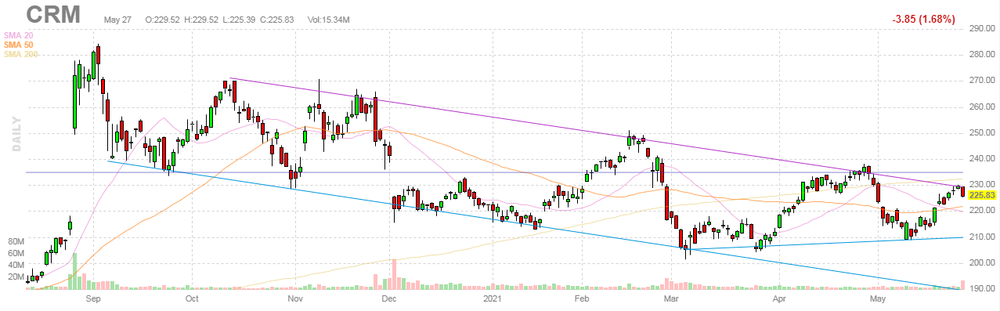Salesforce сообщила, что в последнем квартале заработала $1.21 в расчете на одну акцию, что оказалось выше среднего прогноза аналитиков на уровне $0.88 на одну акцию. Квартальная выручка компании также превзошла оценку Уолл-стрит и компания огласила превысившие ожидания прогнозы прибыли и выручки на текущий квартал и весь 2021 год. Акции CRM подорожали на 6.1%.