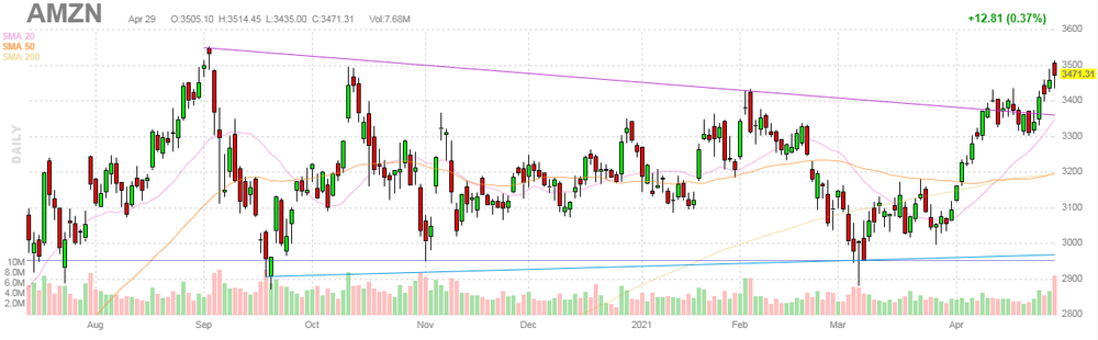 Amazon.com Inc., NASDAQ | AMZN | 3,541.00 | 69.69(2.01%) | 196876 |