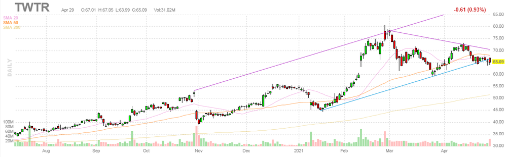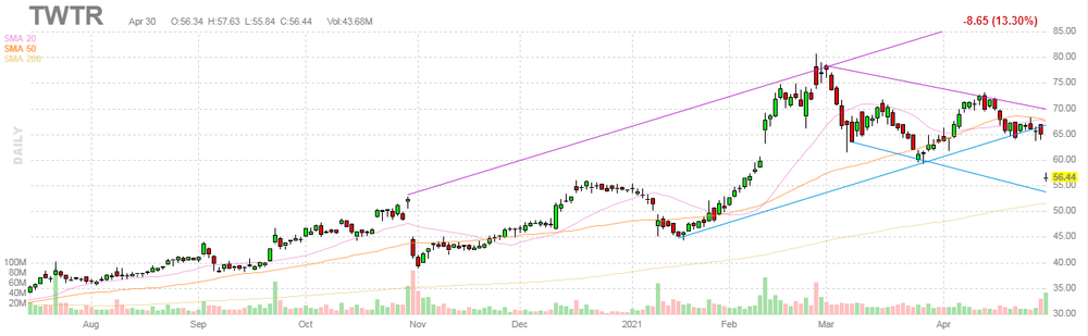 На текущий момент акции TWTR котируются по $56.44 (-13.30%).